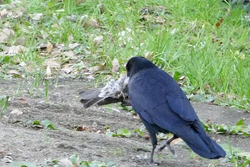 昨日の散歩の途中で、カラスが何か大きな物を咥えている光景に出合った。 オヤッ!何だろう? ゴミでも咥えてるのか?と思ってカメラを向けてみると・・ 鳥の尾羽根のようなものが見える。。 近づくと獲物を咥えたまま近くの木の枝に飛び移って獲物を突っつ…